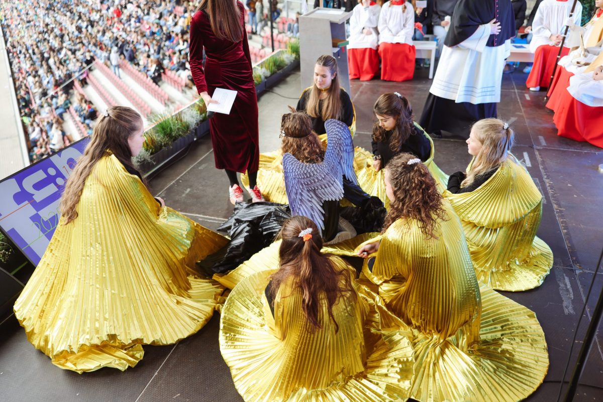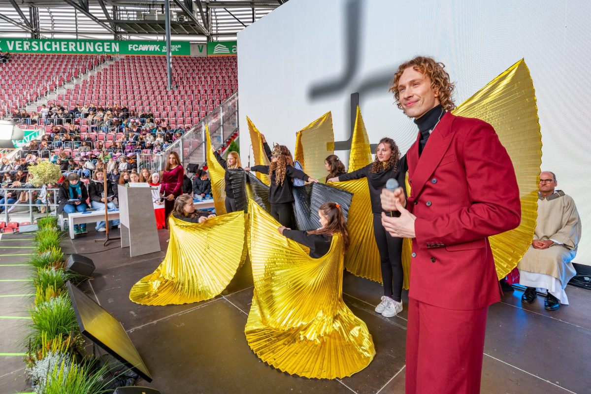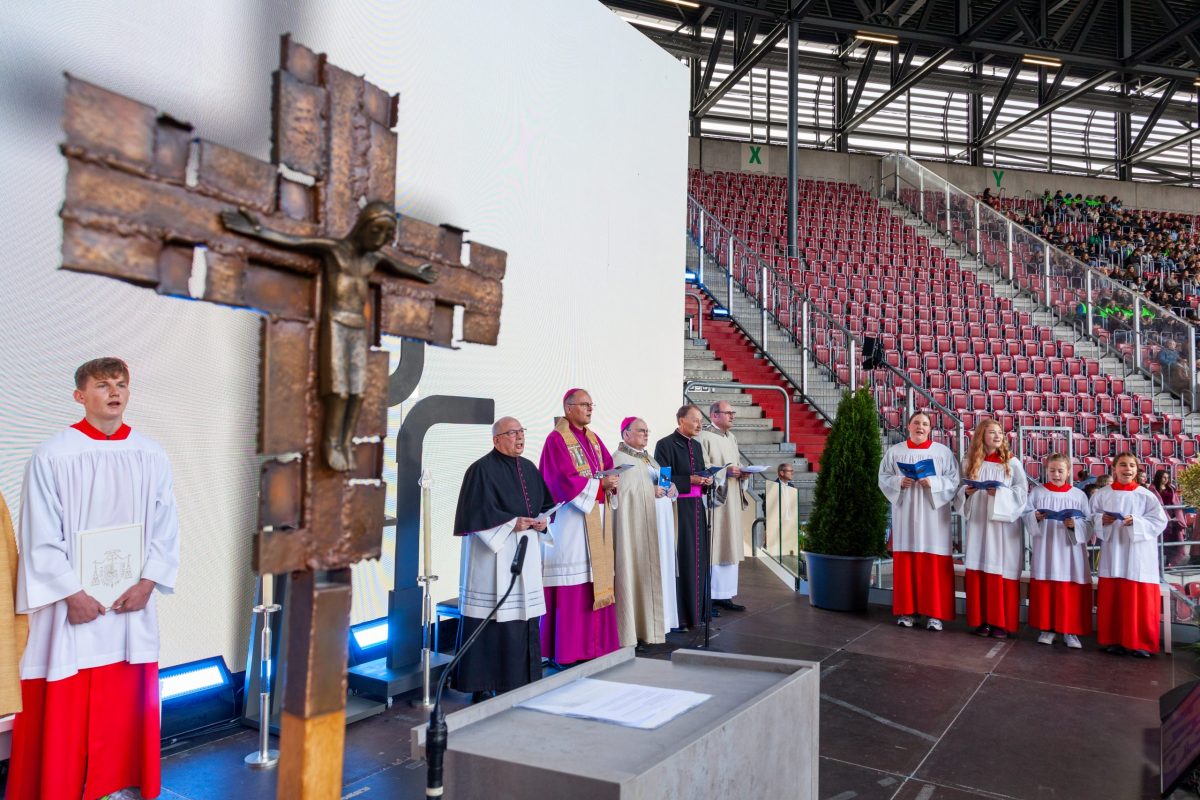 Übertroffen wurde die Musik nur von Bischof Bertrams humorvoller und zugleich tiefsinniger Ansprache. Mit einem Augenzwinkern griff er das Fußball-Motto des Tages auf und verwandelte das „Halleluja“ kurzerhand in einen echten Stadion-Ruf: „Gebt mir ein H, gebt mir ein A …!“ – rief er in die Menge, und 20.000 Stimmen antworteten begeistert. In diesem Augenblick verschmolzen Stadionjubel und Gotteslob zu einem einzigen, mitreißenden „Halleluja“. So wurde aus dem alten hebräischen Wort für Lob und Freude ein kraftvoller Ruf, der alle im Stadion vereinte.