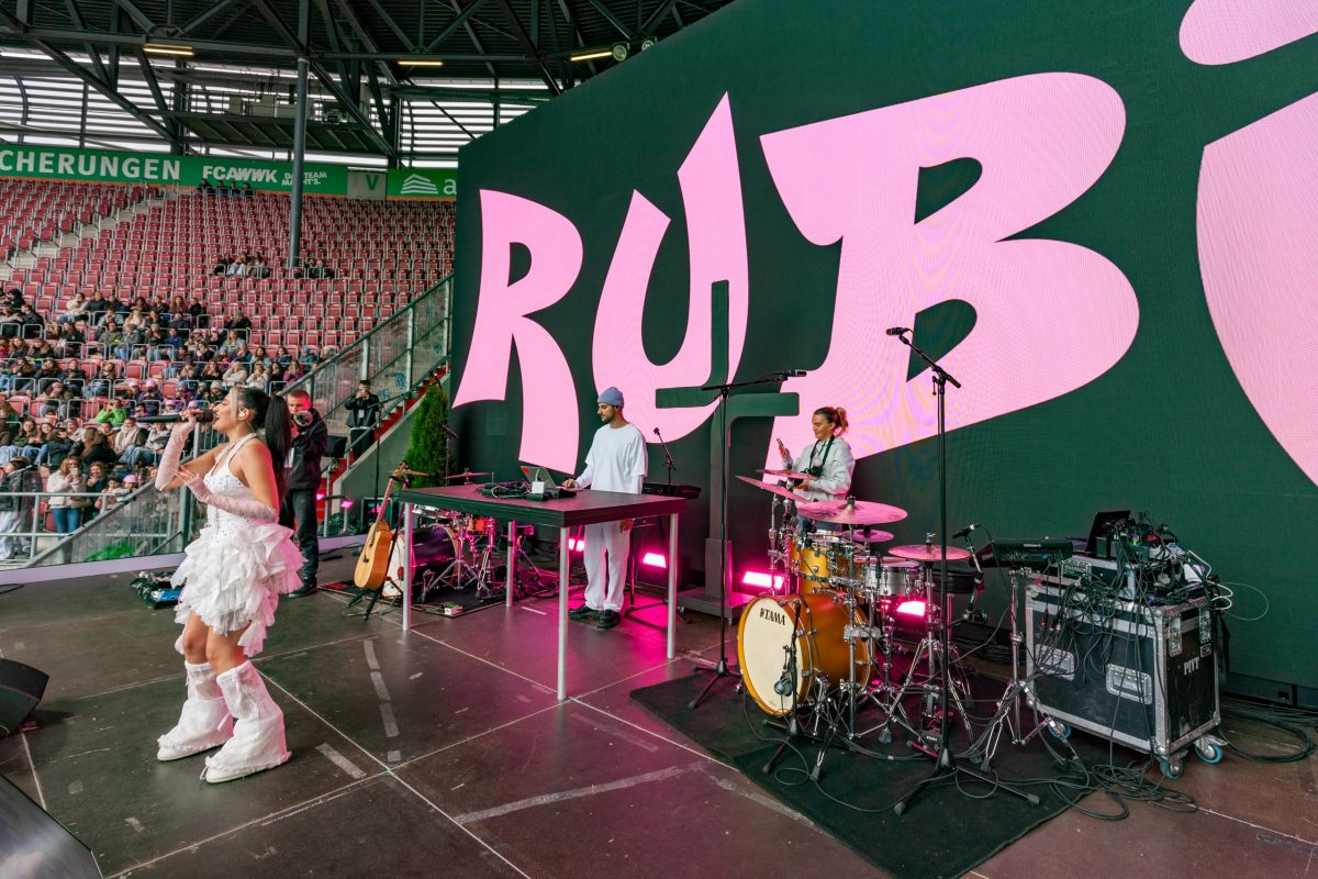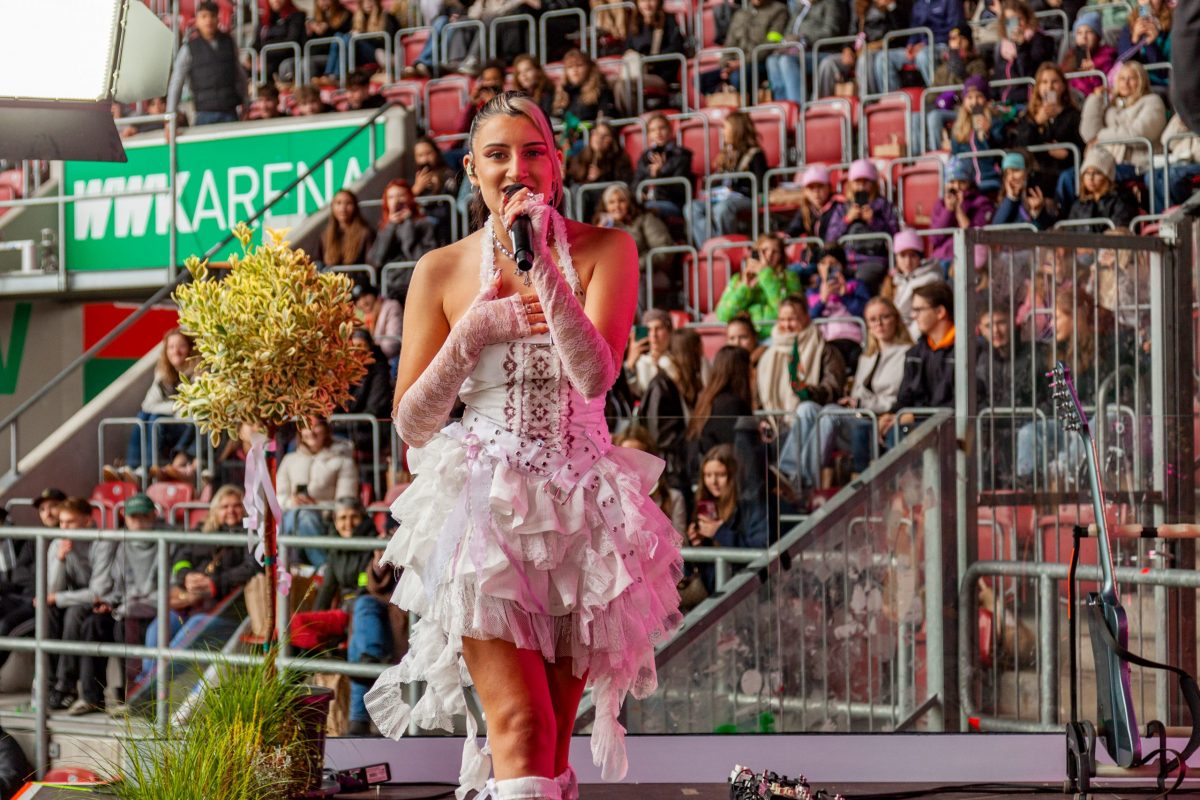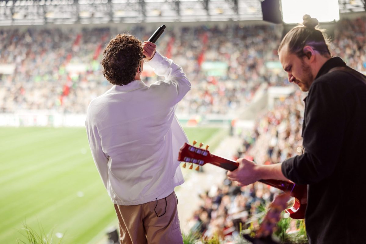 Als die ehemalige Schulwerksschülerin und Rapperin Rubi schließlich als weiterer Showact die Bühne einnahm, blieb wirklich keiner mehr sitzen, Schüler tanzten mit und die Party-Stimmung stieg. Die Atmosphäre war ausgelassen, mitreißend und voller gemeinsamer Energie – ein Moment, in dem das Stadion bebte vor Begeisterung. Auch ohne La-Ola-Welle sorgte danach Singer-Songwriter Levent Geiger mit seinen Hits für Gänsehautmomente und ein Handy-Lichtermeer, die den Tag unvergesslich machten.
