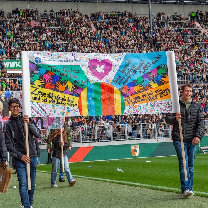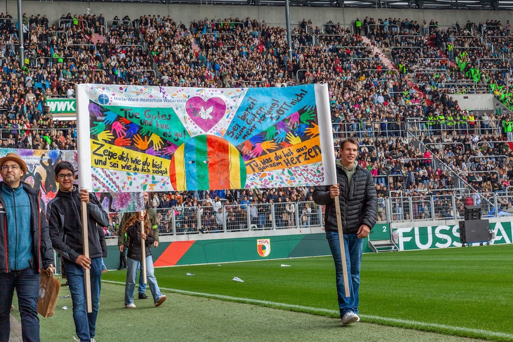 Wo sonst die Fußballprofis des FCA bejubelt werden, wehte an diesem Freitag ein anderer Teamgeist durch die Ränge – der Geist der gesamten Schulfamilie des Schulwerks der Diözese Augsburg. Über 20 000 Schülerinnen und Schüler sowie rund 2300 Mitarbeiterinnen und Mitarbeiter aus 46 Schulen waren zur großen Geburtstagsfeier am 10. Oktober 2025 eingeladen.