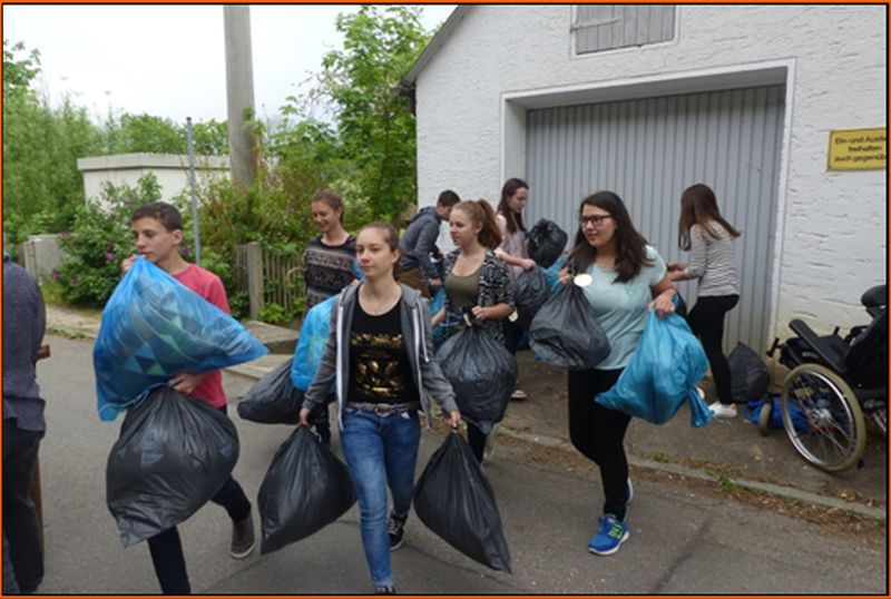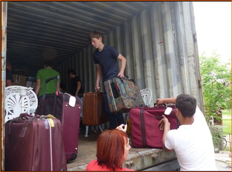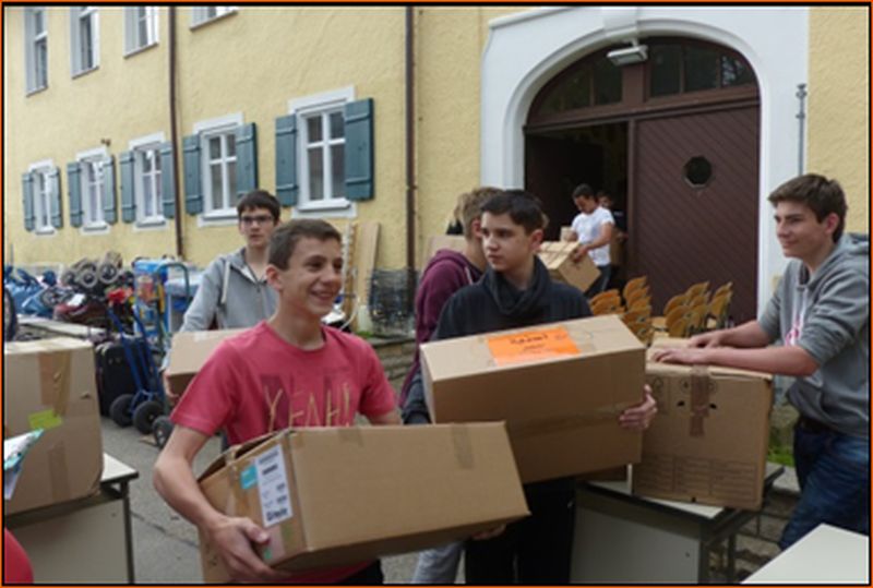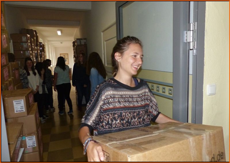 Jetzt galt es den Container zu bestellen. Die eine Spedition verweigerte die Anlieferung eines Containers mit dem Grund, dass viel zu wenig Platz vor der Schule sei. Das war nun wirklich ein Schock. Glücklicherweise sah eine andere Spedition darin kein Problem. Aber es kamen nur vage Aussagen zum Termin. Wir bekamen keine Zusage für unseren Wunschtermin am 9. Mai. Egal, wir machten uns bereit alle Sachen aus dem Dachgeschoss in den Eingangsbereich zu bringen, damit wir auf jeden Fall schnell bereit wären zu beladen, denn dazu hatten wir nur 2 Stunden Zeit, wenn wir nicht zusätzliche Kosten in Kauf nehmen wollten; alles dann von ganz oben zu holen, würde auf jeden Fall zu lange dauern. So brachten am Freitag, dem 6.Mai verschiedene Klassen alles runter in den Eingangsbereich und stapelten es wunderbar geordnet unter Leitung von Herrn Altenburger. Nachmittags wurde jeder Karton noch vom Elternbeirat nummeriert, damit für den Zoll eine detaillierte Liste erstellt werden konnte. Unsere Schule sah aus wie eine gut geführte Lagerhalle.